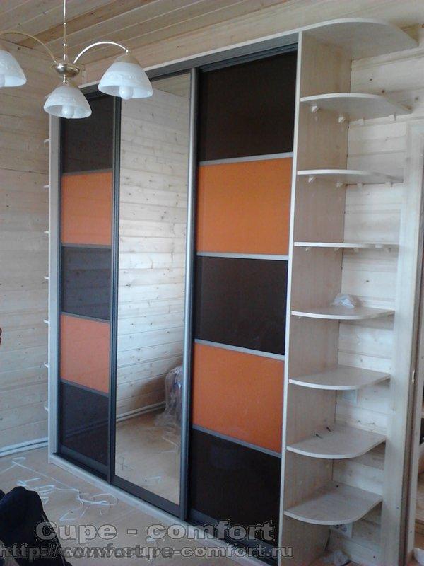 Трехдверный шкаф купе с фасадами купе скомбинированные из цветных стекол удовлетворит все потребности хранения вещей, а использование дополнительного элемента - "углового терминала" с обеих сторон шкафа, позволит украсить его, и держать под рукой всегда и часто необходимые вещи.